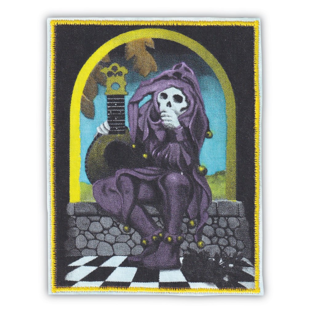 Screen printed patch with hand coloring on dyed fabric with sewn edge.
